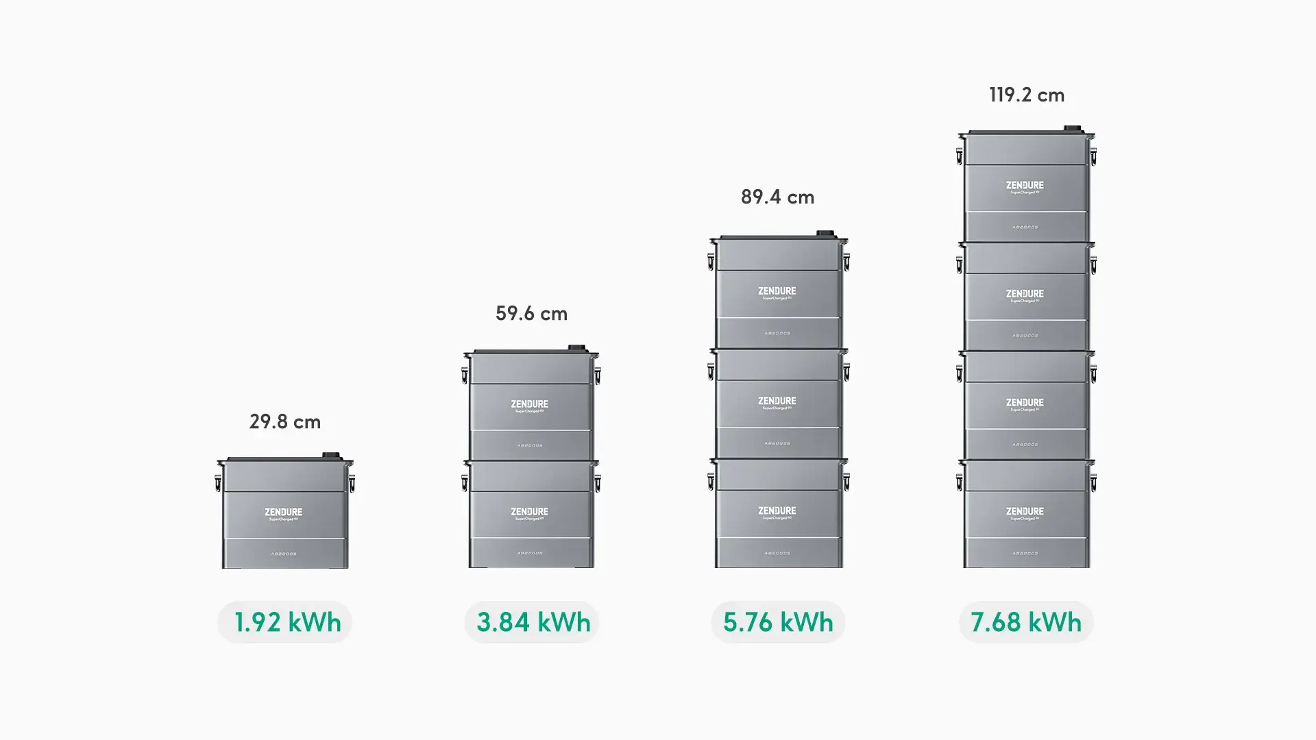 SolarFlow Kits’ AB2000S battery features an expandable design, allowing easy stacking for capacity expansion—no cables required. A single battery starts at 1.92 kWh and can expand up to 7.68 kWh for extended usage.